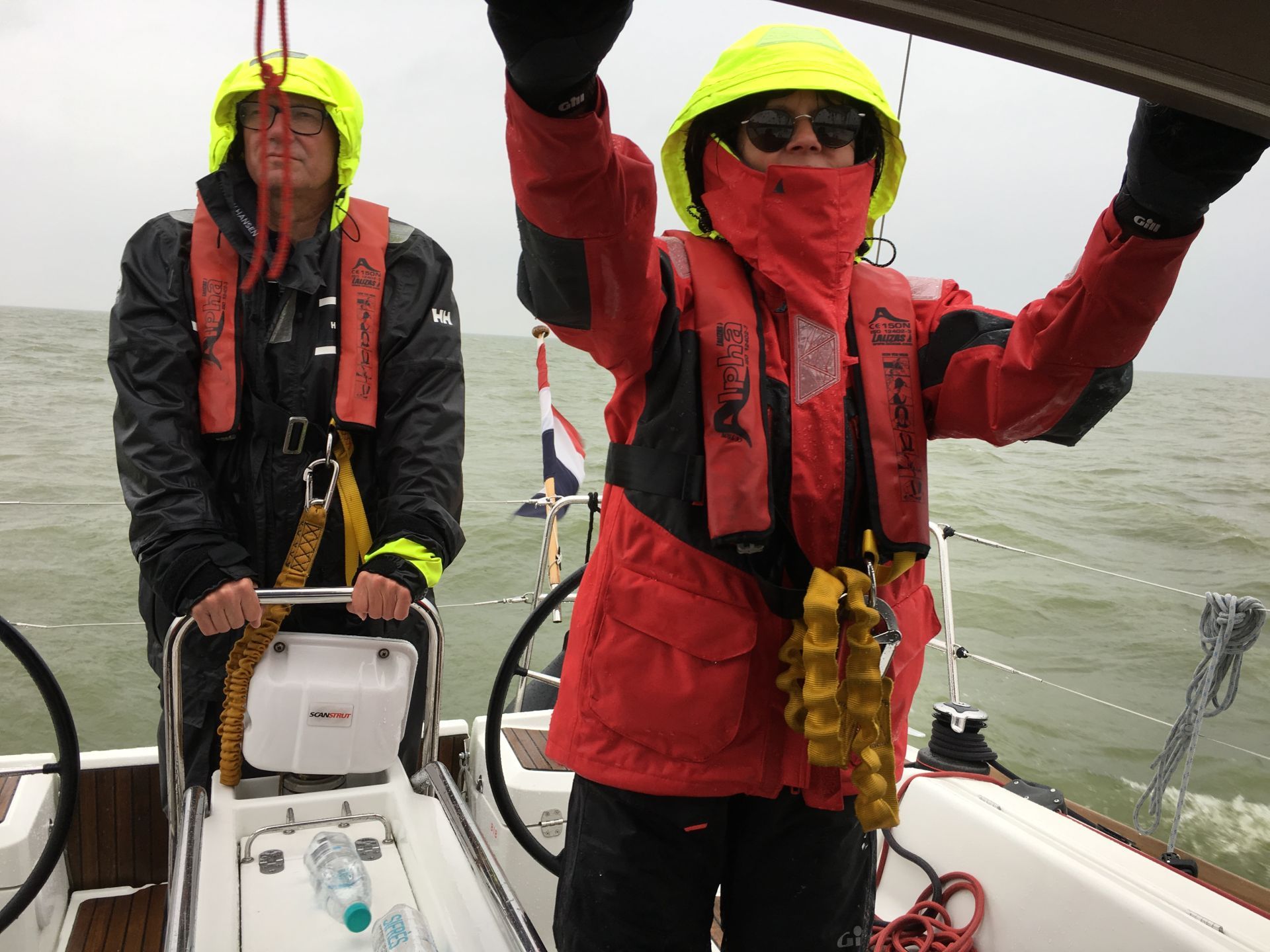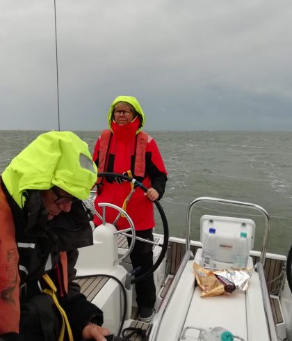 Unterwegs wurden wir von einer Gewitterfront überrollt, die starke Böen, höheren Seegang, Starkregen und Hagel mit sich brachte. Das Boot stampfte ordentlich. Der Verfasser litt unter Seekrankheit, als er unter Deck versuchte in der Karte nach dem Kurs zu schauen. Es wurde erst auf Deck wieder besser bei leichter Steuertätigkeit.