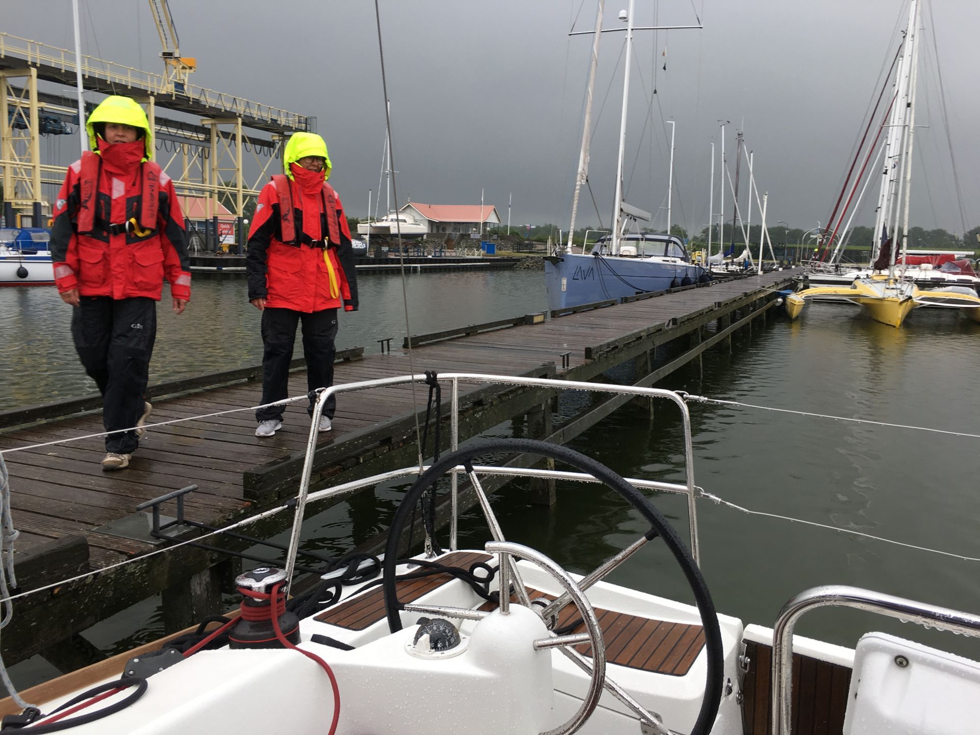 Unterwegs wurden wir von einer Gewitterfront überrollt, die starke Böen, höheren Seegang, Starkregen und Hagel mit sich brachte. Das Boot stampfte ordentlich. Der Verfasser litt unter Seekrankheit, als er unter Deck versuchte in der Karte nach dem Kurs zu schauen. Es wurde erst auf Deck wieder besser bei leichter Steuertätigkeit.